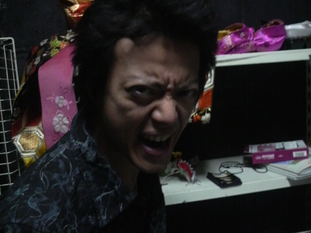 楽屋で恐い顔をしてくれる太一郎さん。